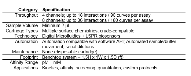 Revo fills critical gaps in SPR by combining digital microfluidics with nanotechnology-based biosensors in a compact, affordable system. Its disposable cartridge supports the same throughput as a 96 well plate (four-channel), without fluidics maintenance and with crude sample compatibility. With low sample requirements, full automation, and consistent, publication-quality data, Revo makes gold-standard SPR accessible, scalable, and cost-effective for any lab.